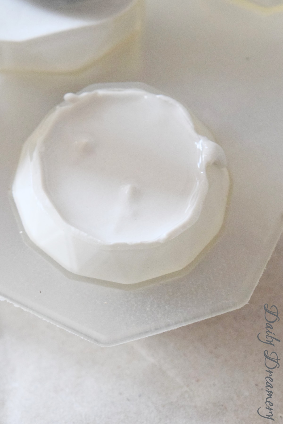 Mischt die Gießmasse oder den Gips nach Packungsanweisung an. Ich habe in diesem Fall Gießmasse verwendet, da diese schneller fest wird. Das ist dann hilfreich, wenn ihr auch Reagenzgläser oder Kerzen in eure Diamanten setzen wollt. Wenn ihr das nicht machen möchtet, dann ist Gips ganz genauso gut zu verwenden.