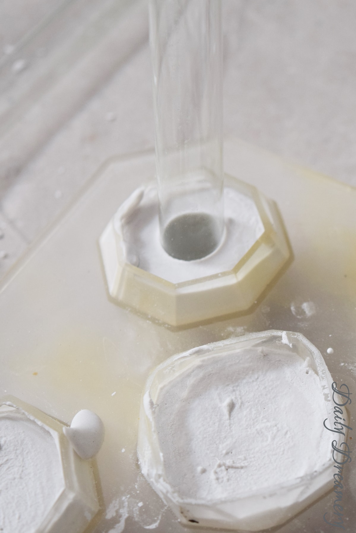Füllt nun die Gießmasse oder den Gips vorsichtig in die Silikonform. Wenn ihr nun auch kleine Vasen herstellen wollt, dann setzt nun vorsichtig ein Reagenzglas in die Mitte eines Diamanten und achtet dabei darauf, dass ihr dieses nicht bis zum Boden durchdrückt. Nun braucht ihr etwas Geduld und eine ruhige Hand. Versucht das Reagenzglas so ruhig und gerade wie möglich zu halten, während die Gießmasse anzieht. Das dauert in etwa 5 Minuten.