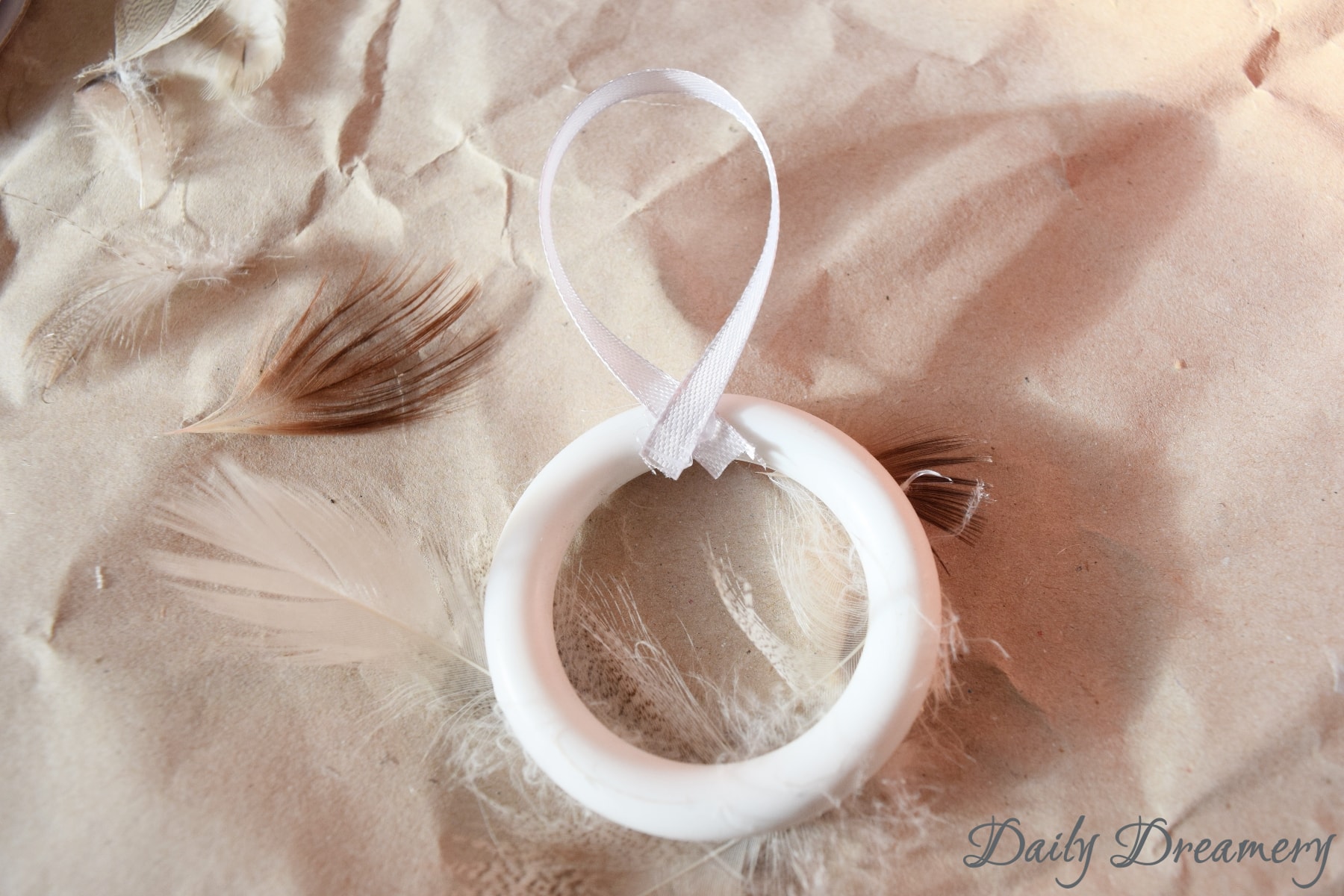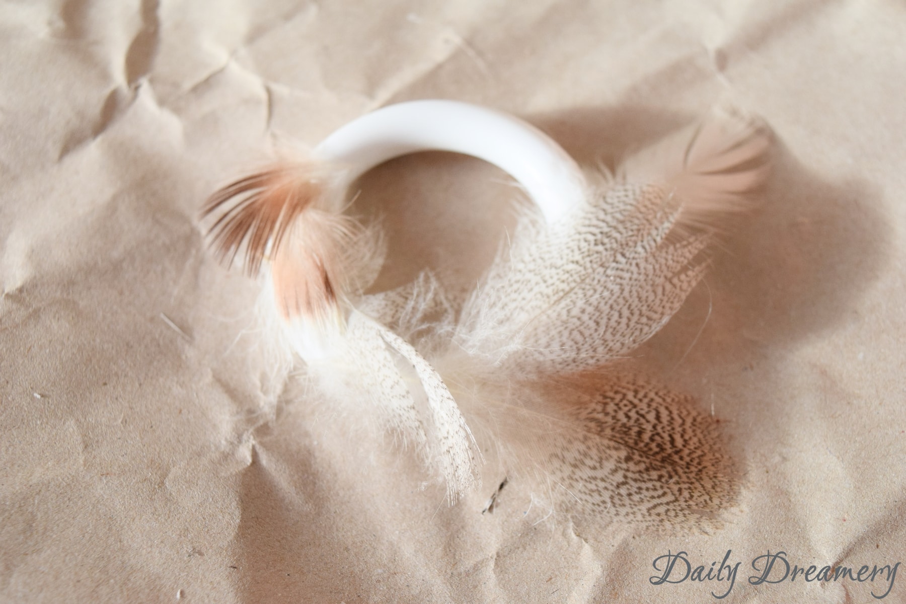 Klebt die Federn nacheinander mit leichtem Versatz auf die Gardinenringe auf und zwar so, dass die Federkiele der vorangegangenen Federn jeweils verdeckt werden. Nehmt dabei soviele Federn wie ihr mögt. Mir persönlich hat die Variante, dass nur zwei Drittel des Rings bedeckt sind, am besten gefallen. Aber das ist natürlich ganz euch überlassen.